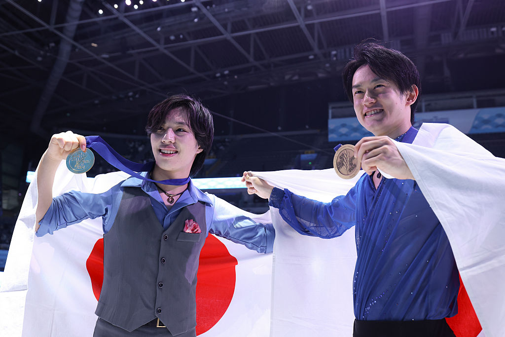 Japan's bronze medalist Sota Yamamoto (right) shares the acclaim with his countryman Kao Miura in Beijing, China © ISU