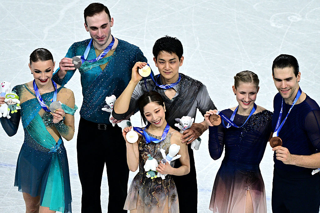 Gold medalists Riku Miura and Ryuichi Kihara, silver medalists Anastasiia Metelkina and Luka Berulava, and bronze medalists Minerva Fabienne Hase and Nikita Volodin © Getty Images