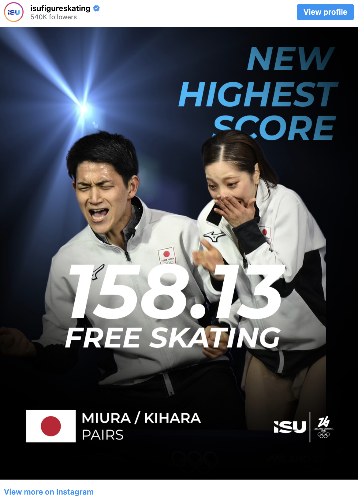 - Miura & Kihara set a new highest Pairs Free Skating score (158.13 points).