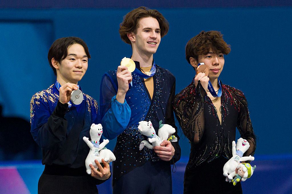 Yuma Kagiyama, Mikhail Shaidorov and Shun Sato took home medals after a scintillating night on Friday © Getty Images