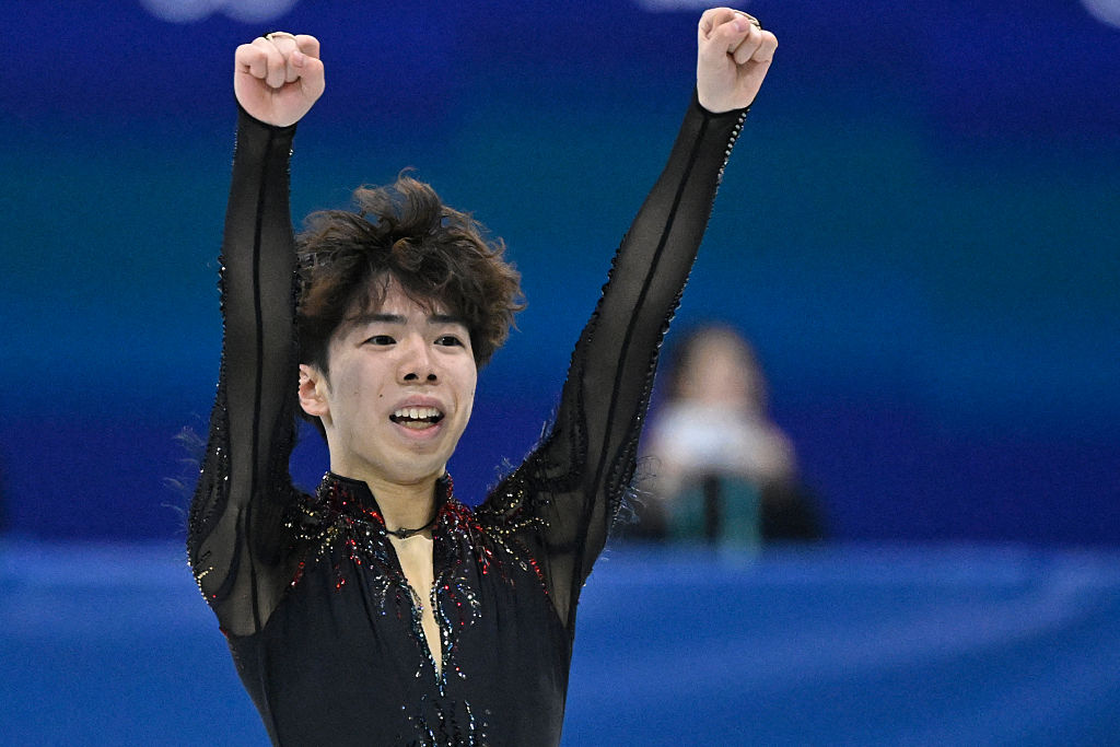 Shun Sato was last to skate and flew high in his flawless “Firebird” routine that featured three quadruple jumps. He was not far behind Malinin in second place at 194.86 points, a new personal best score, and earned nine points for his team.