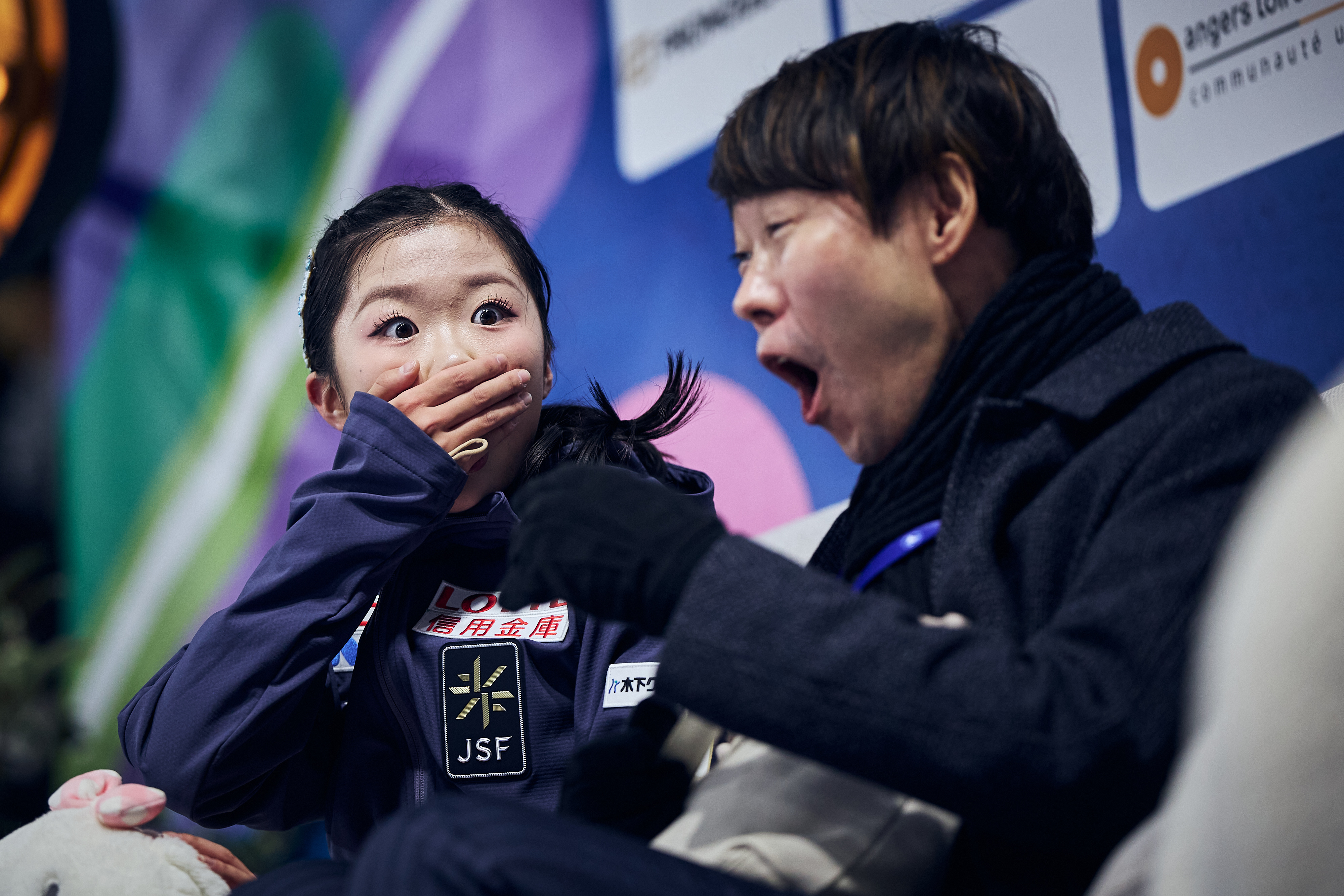 Ami Nakai (JPN) and coach Kensuke Nakaniwa react to her score at the ISU Grand Prix de France © ISU