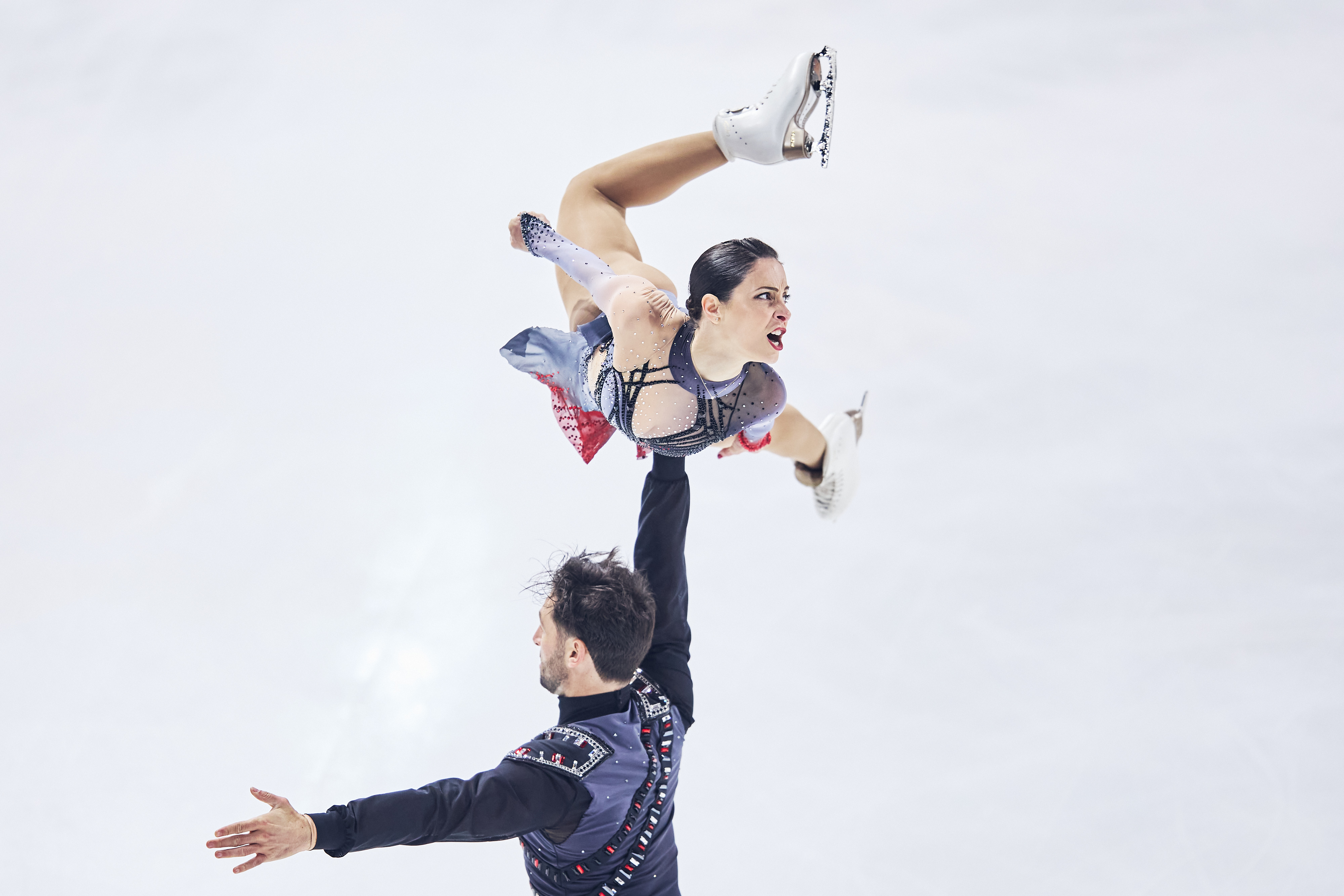 Canada’s Deanna Stellato-Dudek/Maxime Deschamps just never stop to surprise. After staging an unique comeback after 16 years off the ice to become an ISU World Pairs Champion in 2024 with Deschamps, Stellato-Dudek is doing something extraordinary again: She backflips from her partner’s chest. No pairs team has done that kind of assisted backflip before in international competition. Backflips became legal in ISU events in the 2024/25 season again following a rule change after being banned for decades.
