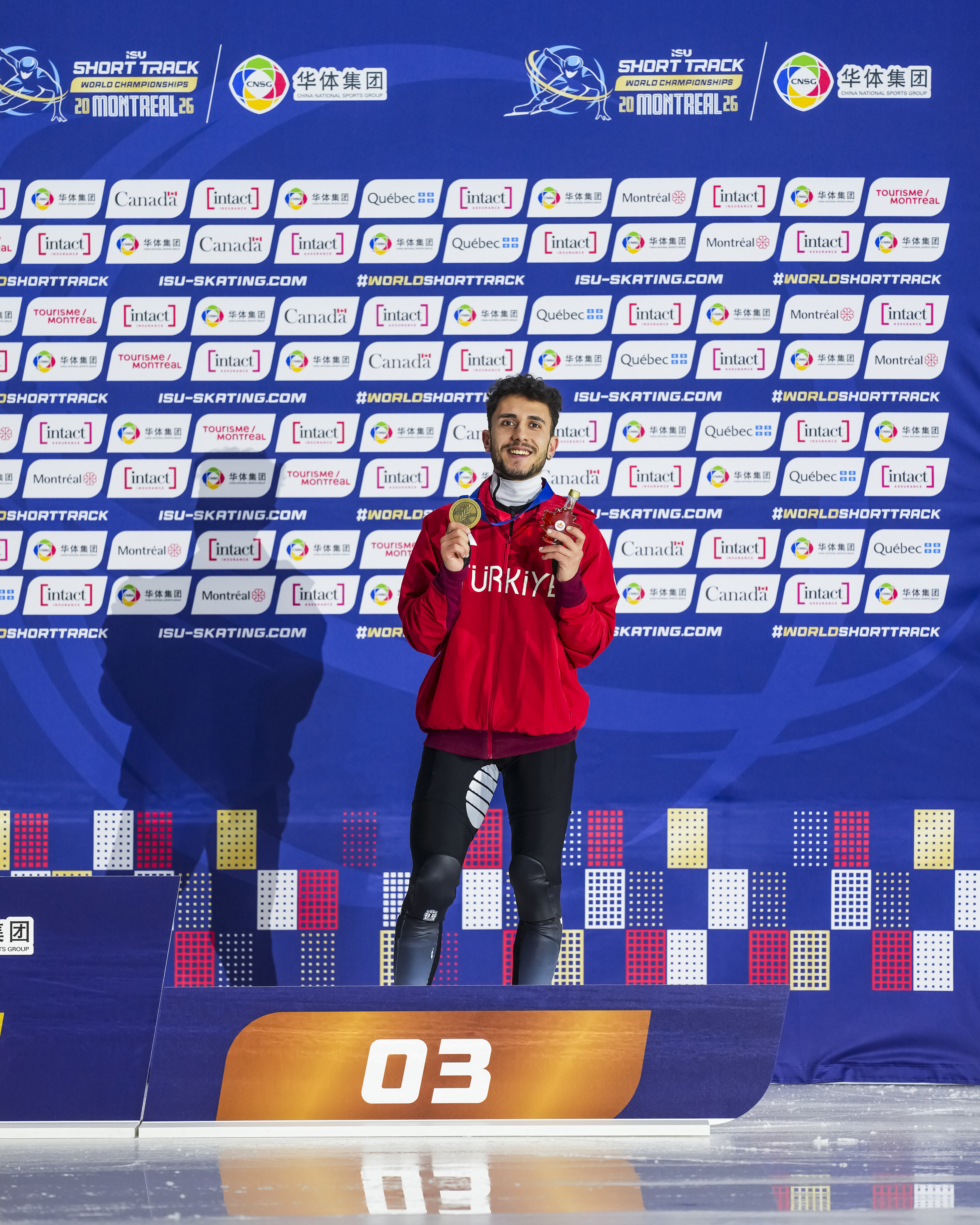 Furkan Akar wins the bronze medal in the Men's 500m final in the ISU CNSG Short Track World Championships in Montreal, Canada, March 2026 © ISU