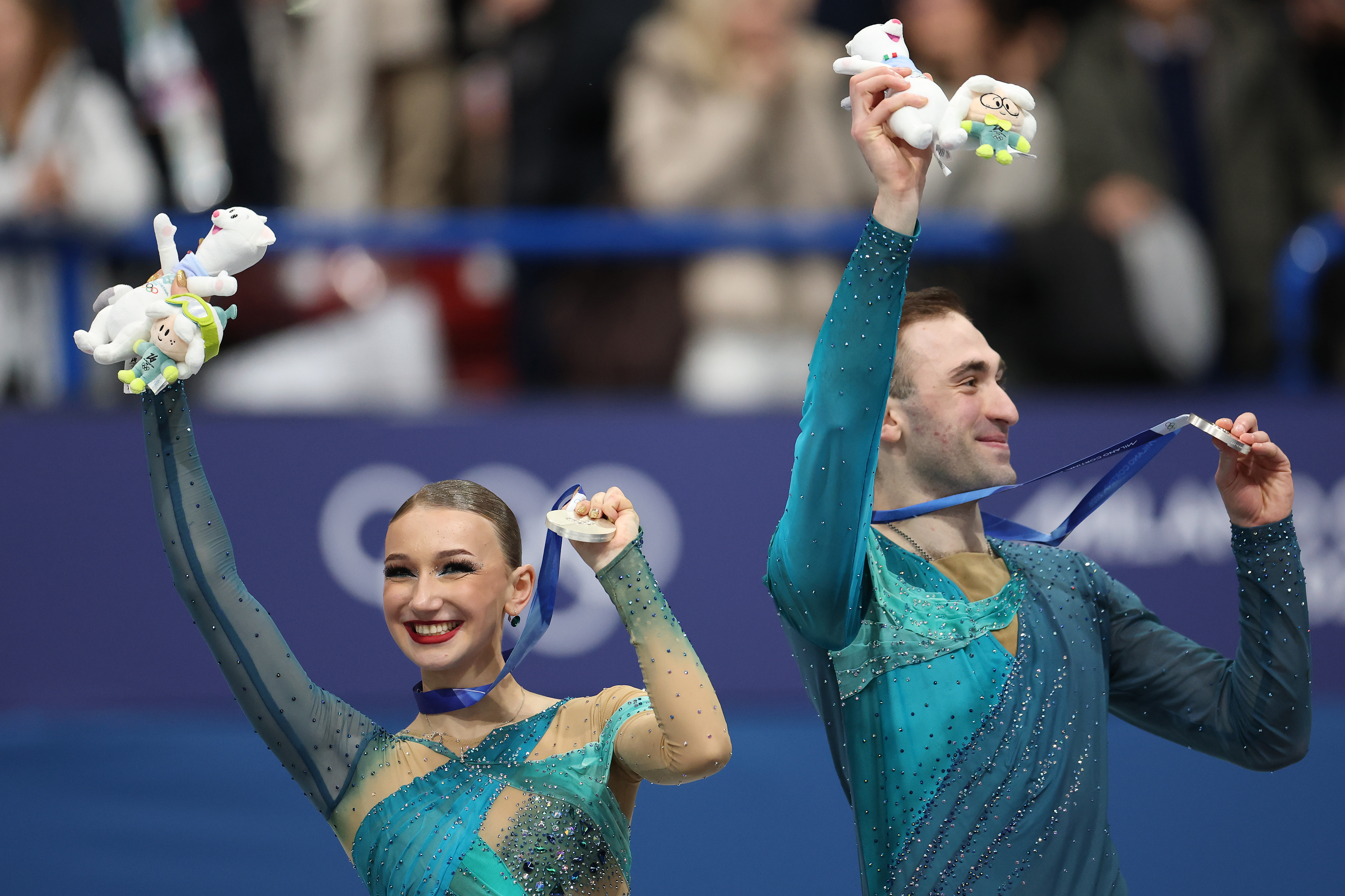 Silver medalists - Pair Skating, Anastaiia Metelkina and Luka Berulava celebrate during the Olympic Winter Games Milano Cortina 2026 in Milan Italy on February 2026 © Getty Images