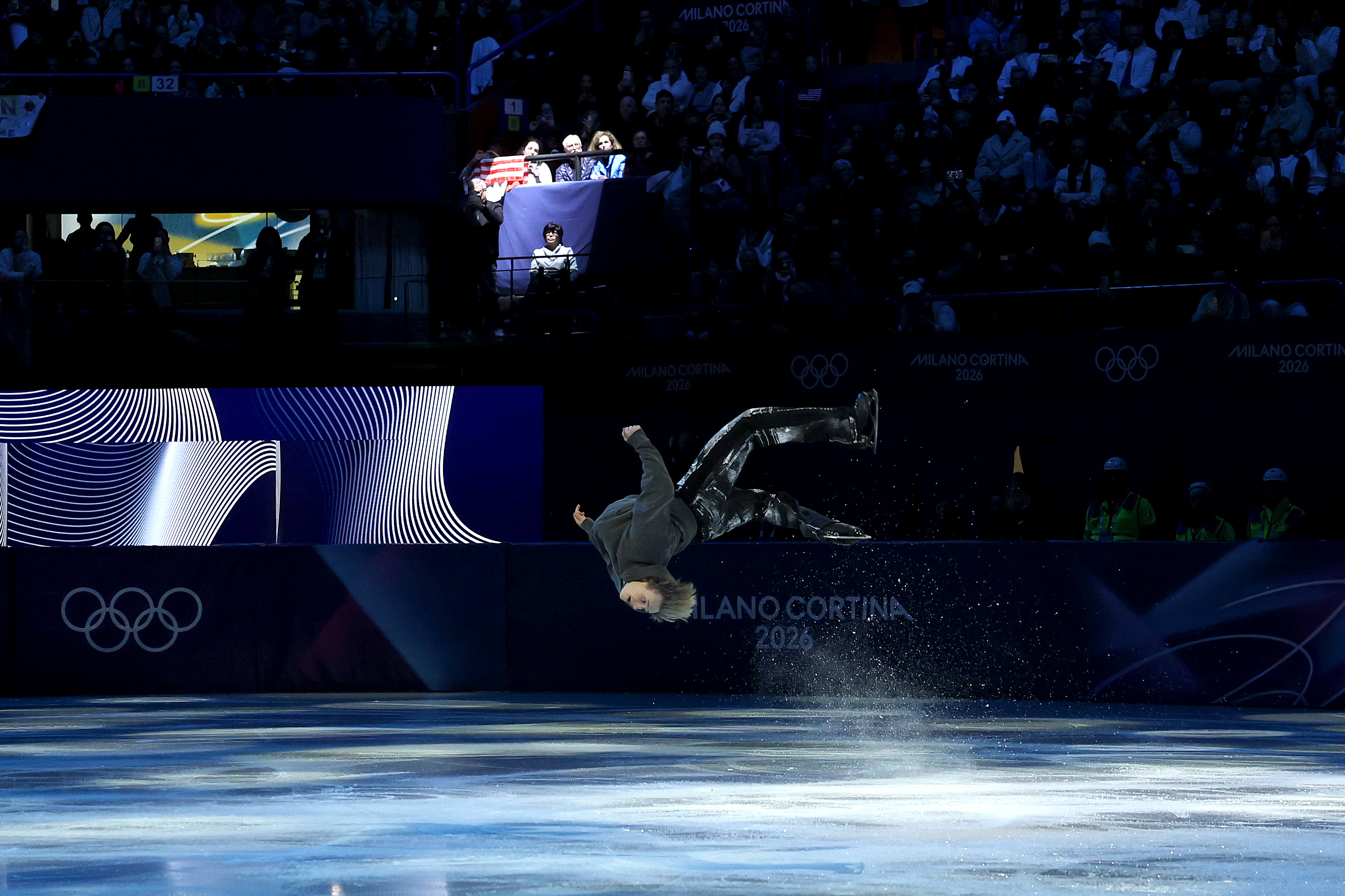 Ilia Malinin performs a back-flip during a Figure Skating Exhibition Gala during the Olympic Winter Games Milano Cortina 2026 in Milan Italy on February 2026 © Getty Images