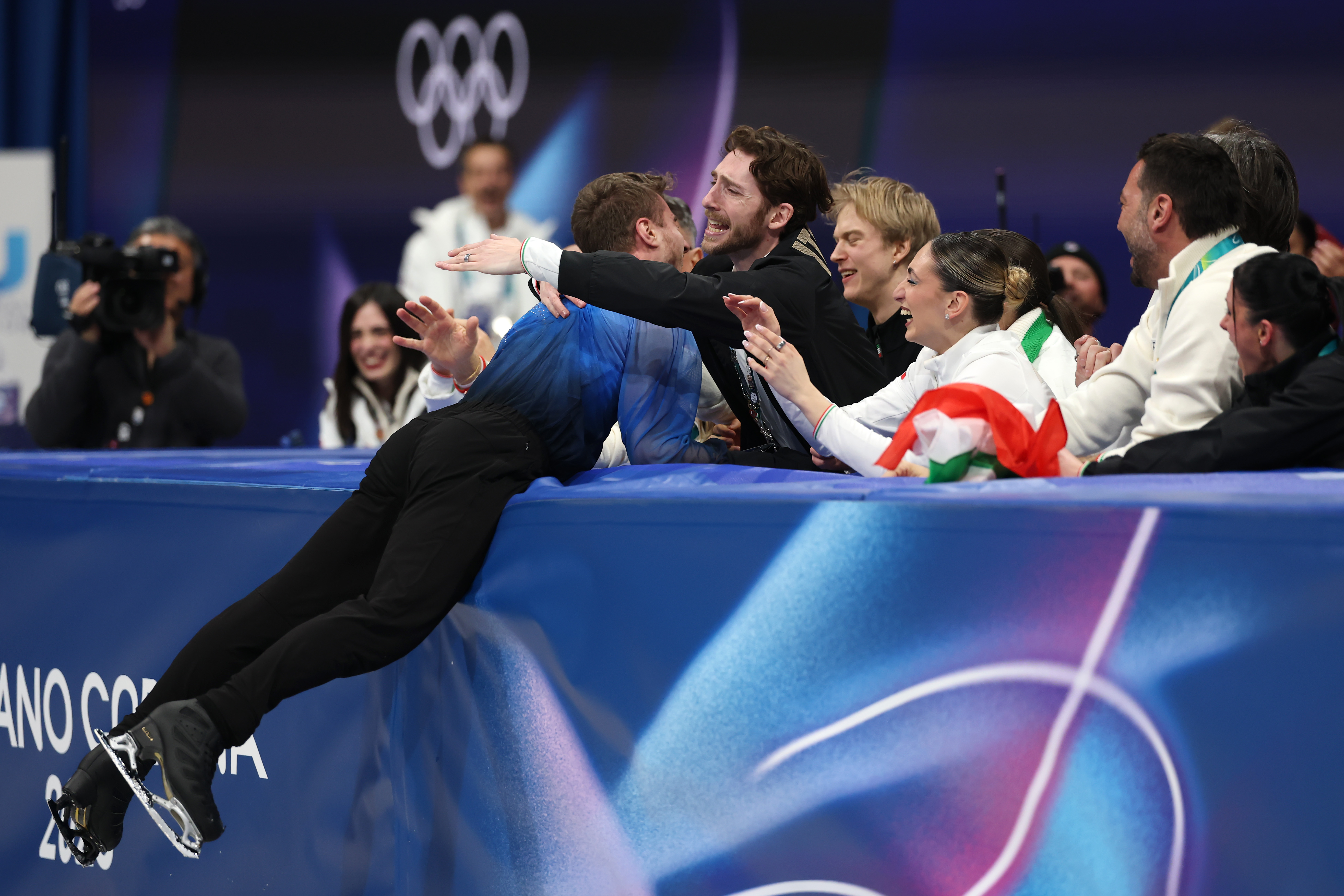 Matteo Rizzo celebrates with his team after competing in Men's Single Skating - Free Skating Team Event during the Olympic Winter Games Milano Cortina 2026 in Milan Italy on February 2026 © Getty Images
