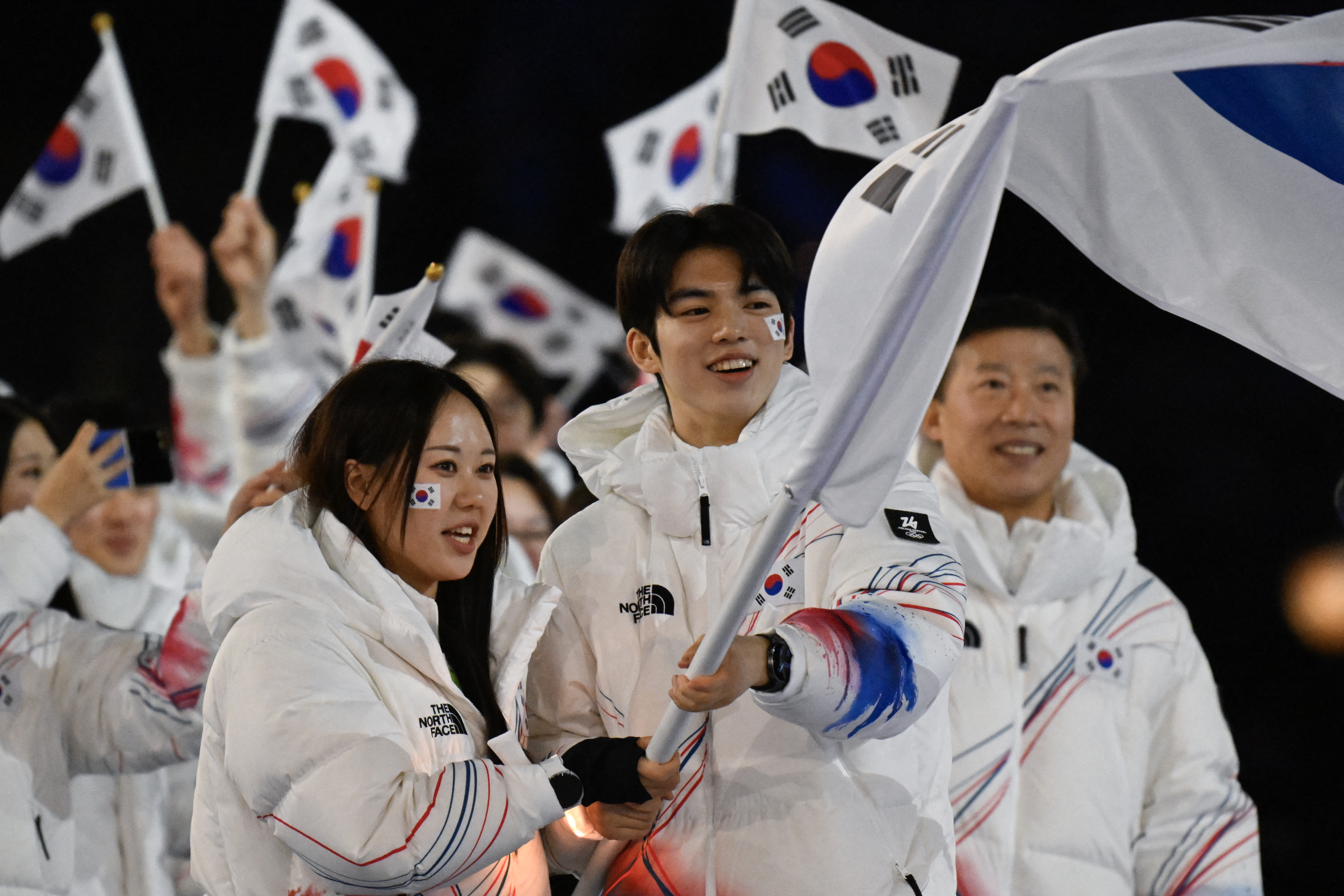 South Korea's flagbearers Park Ji-woo (L) and Cha Jun-Hwan parade during the opening ceremony of the Olympic Winter Games Milano Cortina 2026 on 6 February, 2026 in Milano © Getty Images