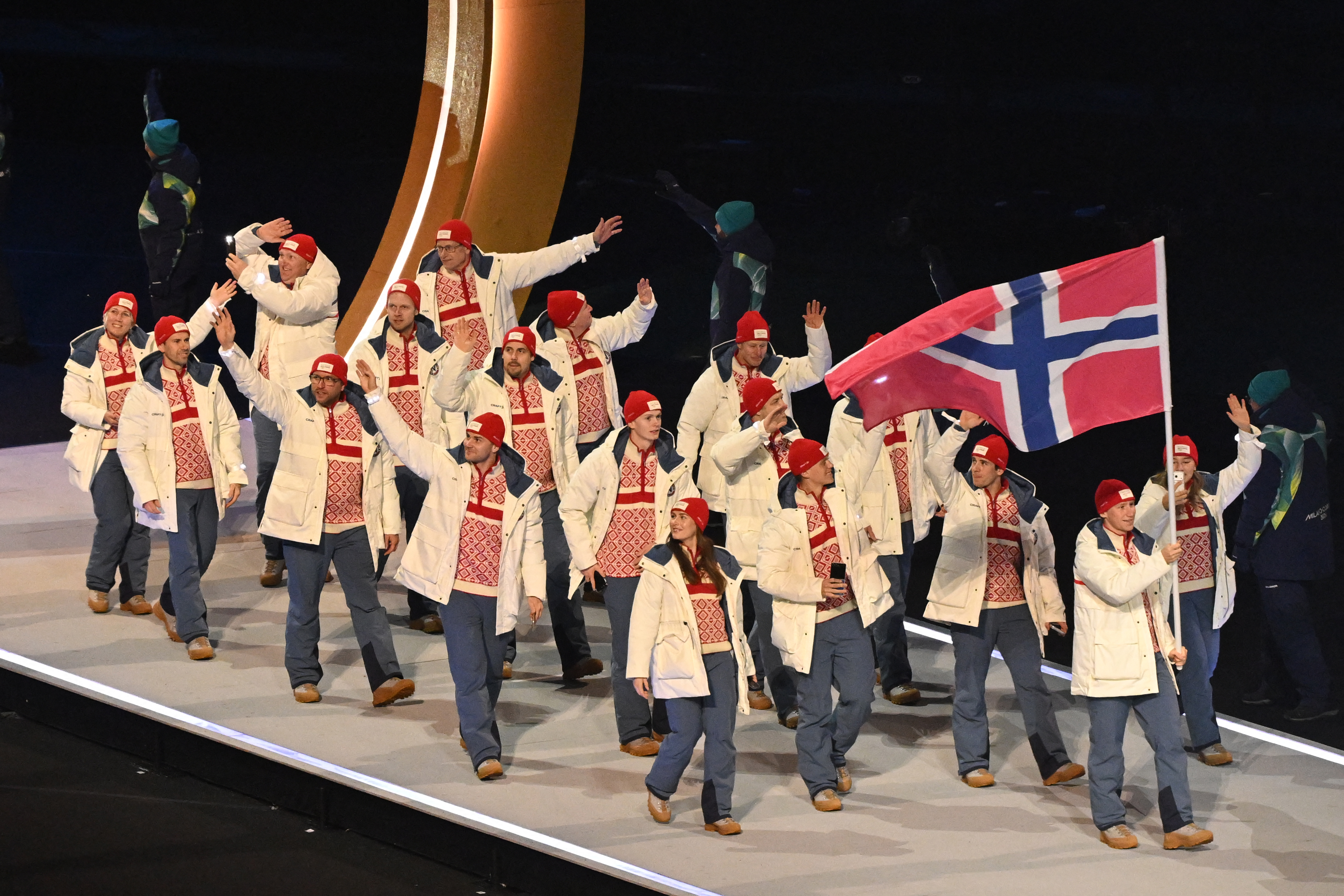 Norway's flag bearer Peder Kongshaug parades with other athletes during the opening ceremony of the Olympic Winter Games Milano Cortina 2026 on 6 February, 2026 in Milano © Getty Images