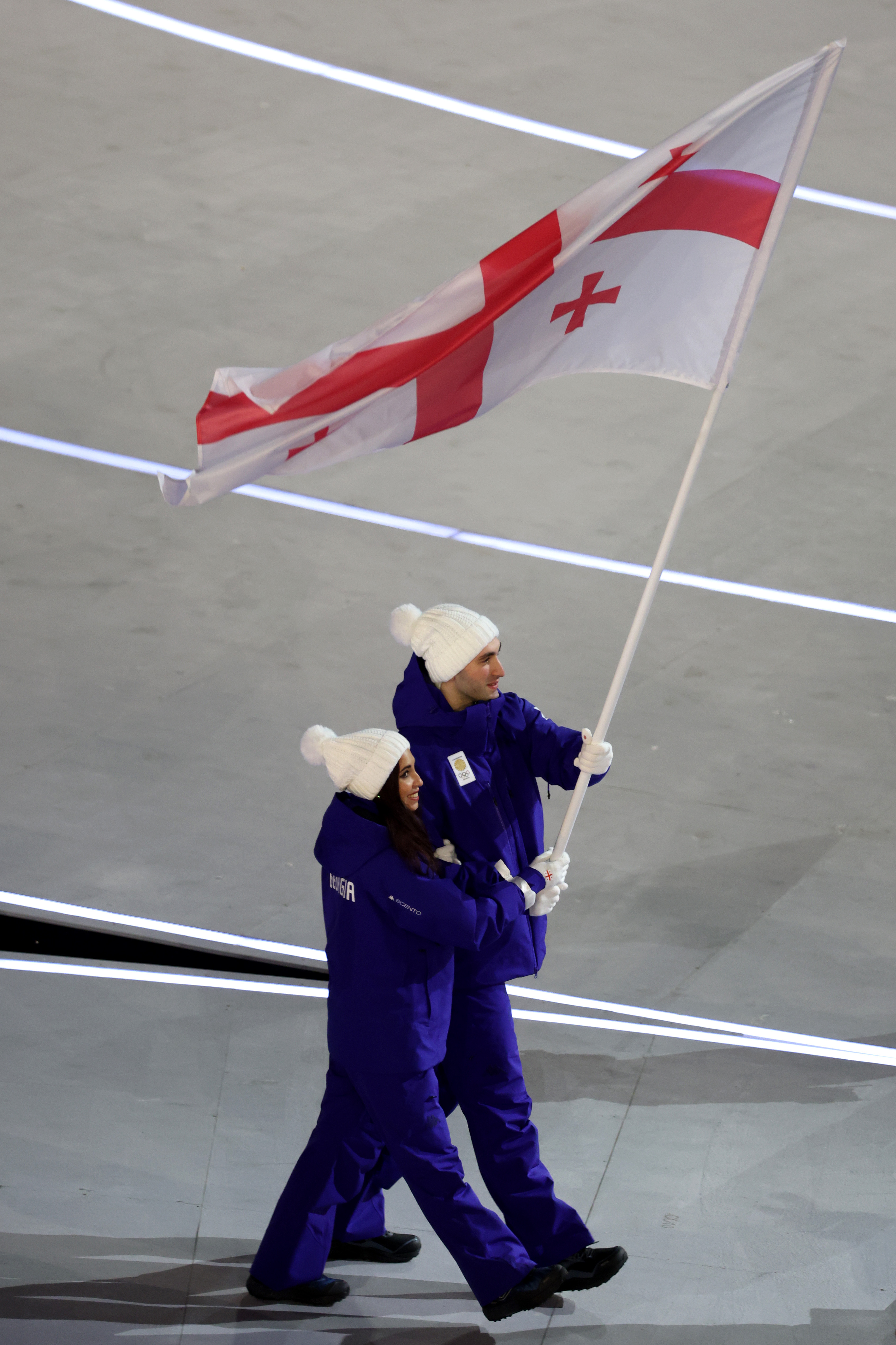 Flagbearers Diana Davis and Luka Berulava of Team Georgia during the opening ceremony of the Olympic Winter Games Milano Cortina 2026 on 6 February, 2026 in Milano © Getty Images