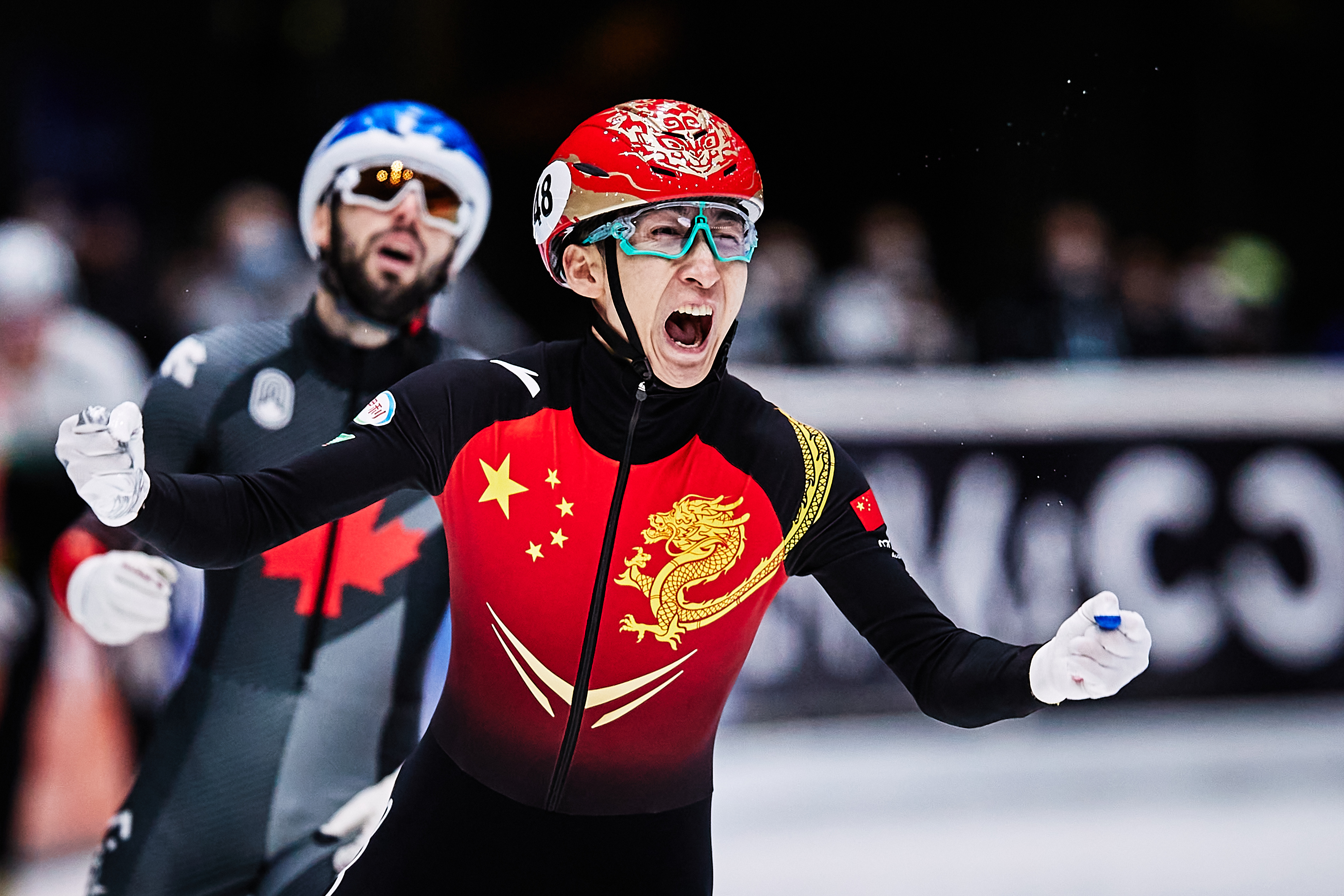 Wu Dajing reacts in the Men's 500m final during the ISU World Cup Short Track in Dordrecht, Netherlands, in 2021 © ISU