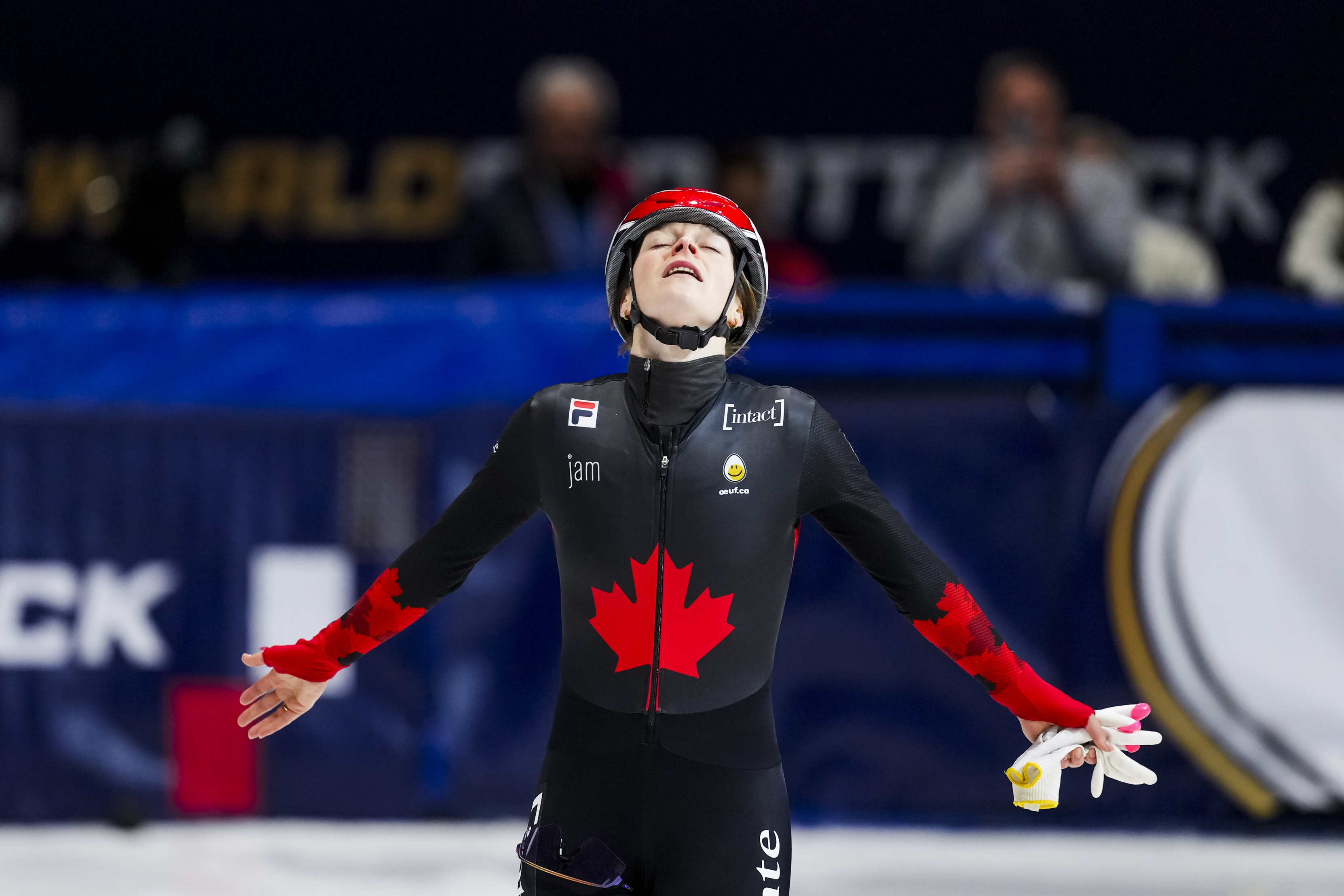 Kim Boutin of Canada reacts to completing the Women's 500m final B during the ISU World Short Track Speed Skating Championship 2026 in Montreal, Canada © ISU