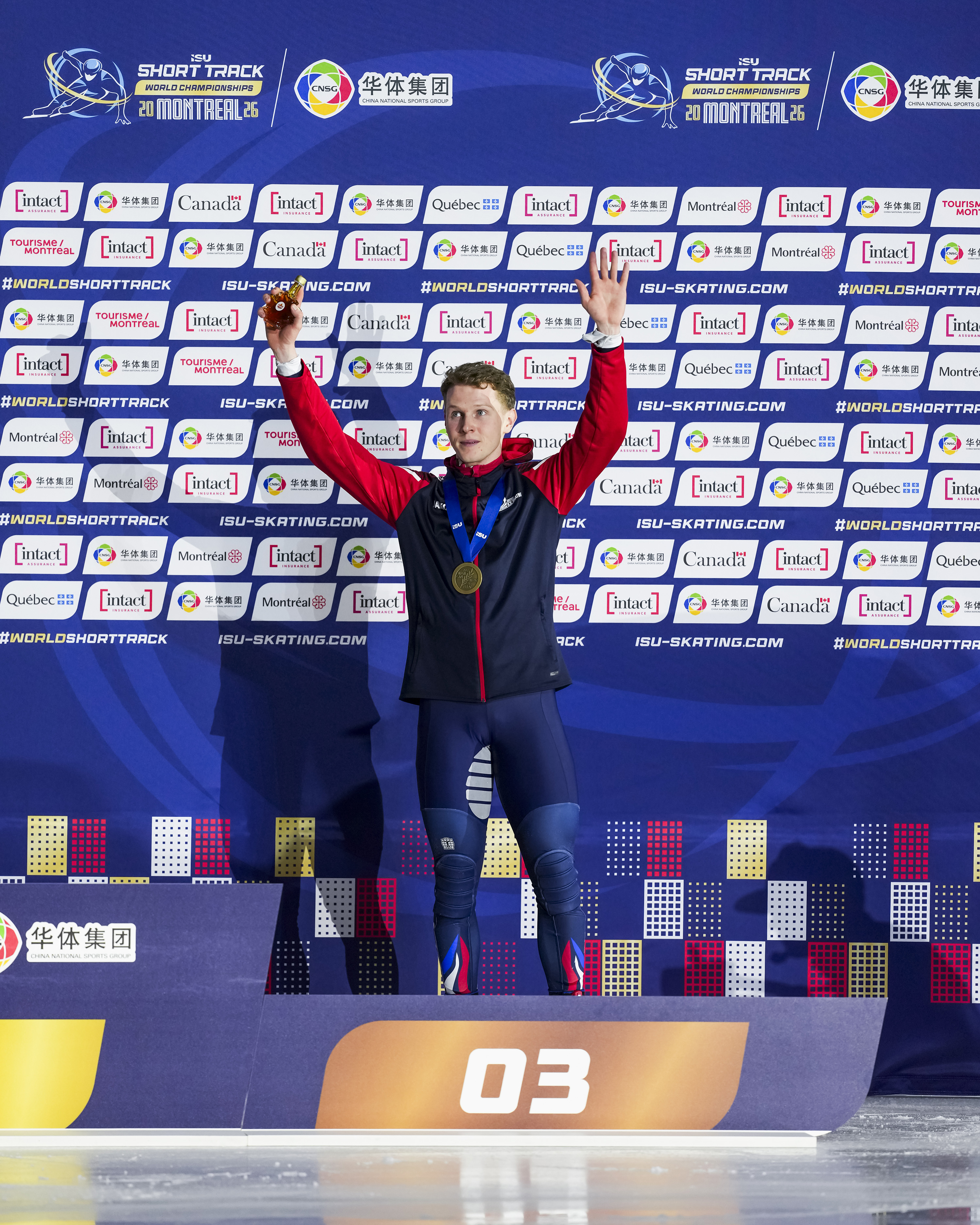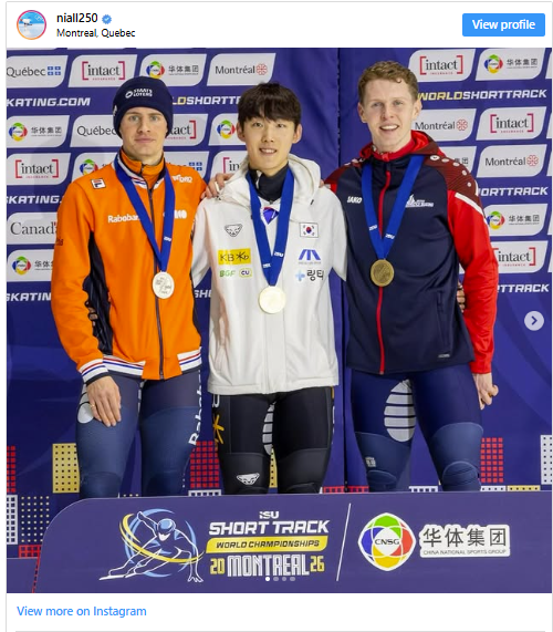 Niall Treacy wins the bronze medal in Men's 1000m in the ISU CNSG Short Track World Championships in Montreal, Canada, March 2026 © ISU