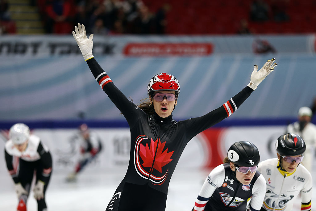 Canadian Ice Maple Courtney Sarault took her second title of the opening weekend of the ISU Short Track World Tour, winning 1500m gold in Montreal © ISU