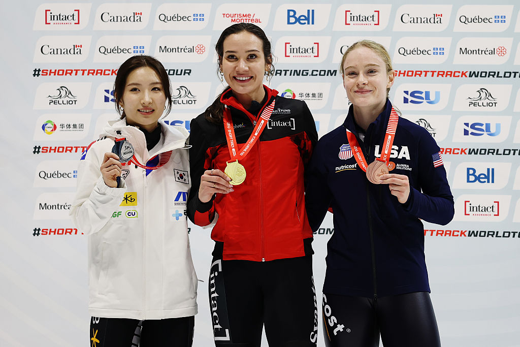 Kim Gilli (KOR), Courtney Sarault (CAN) and Corinne Stoddard (USA) after the 1500m final in Montreal on Sunday © ISU