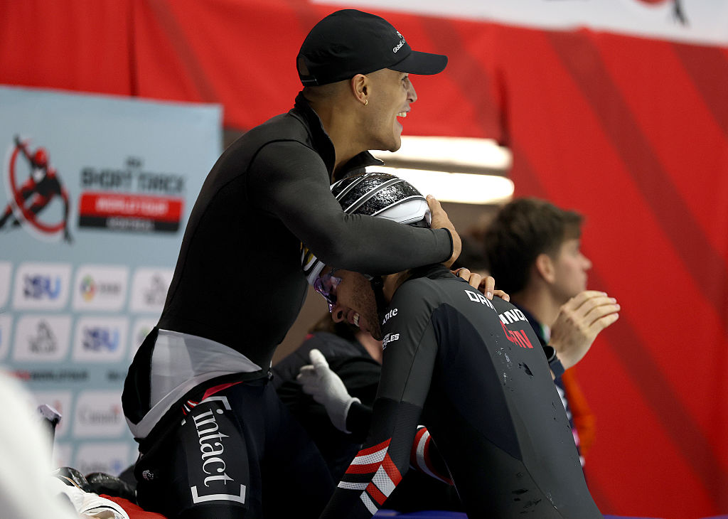 William Dandjinou (CAN) is congratulated by teammate Jordan Pierre-Gilles after winning the 5000m Relay for his fifth gold medal of the ISU Short Track World Tour event in Montreal. © ISU
