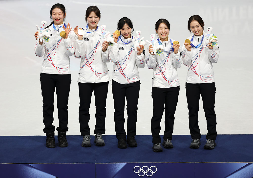 The Republic of Korea team celebrate after winning gold in the Women's 3000m Relay © Getty Images
