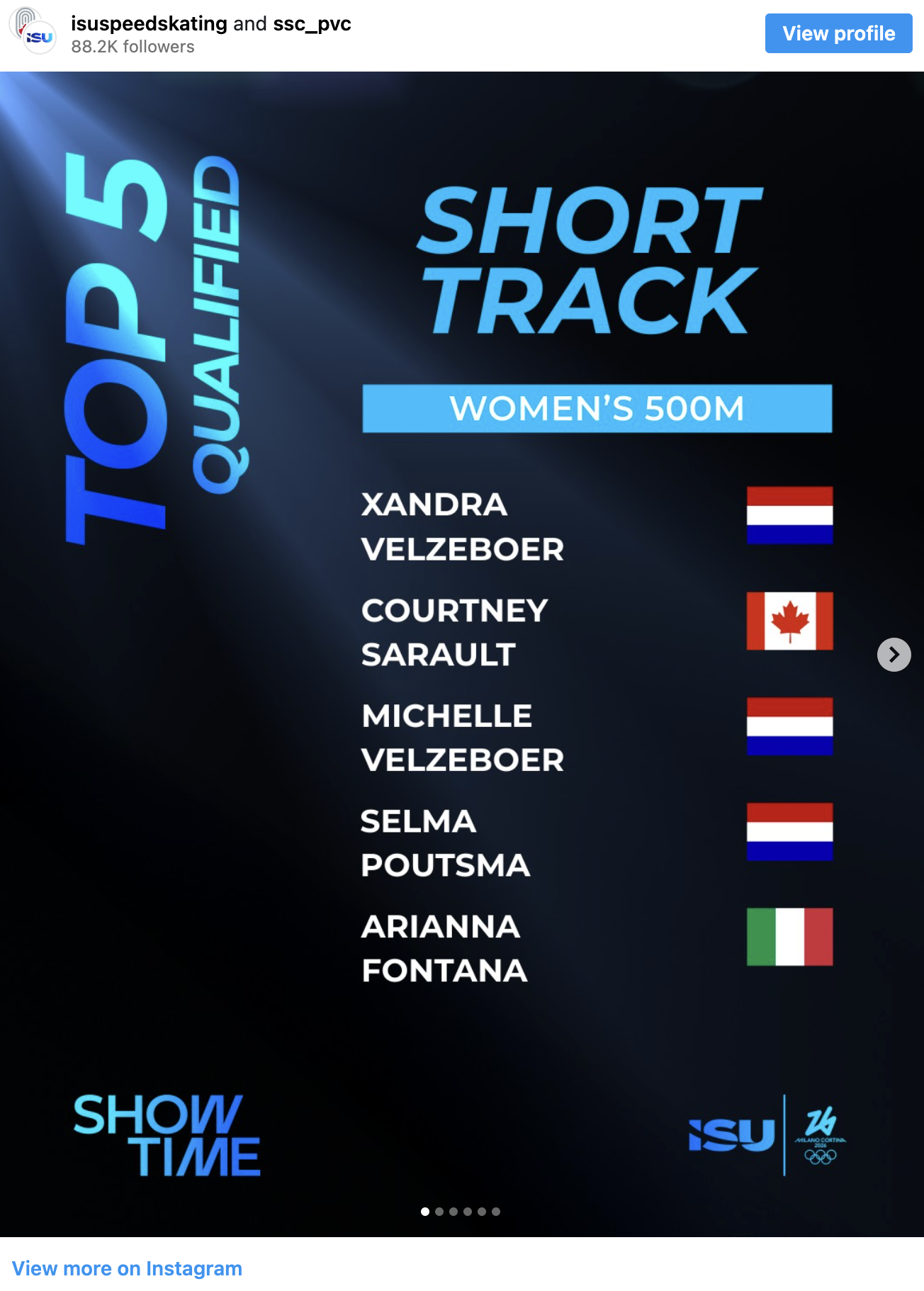 In the Women’s 500m heats, defending Olympic Champion Fontana (ITA), 2022 Olympic bronze medalist Kim Boutin (CAN) and World Record holder Xandra Velzeboer (NED) advanced safely to the quarter-finals.