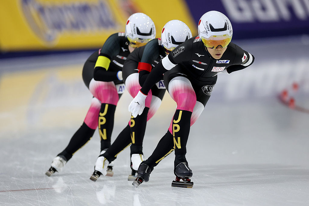 Miho Takagi (front) anchored her Japanese team-mates Momoka Horikawa and Ayano Sato to Pursuit gold but will also seek individual glory in the 1000m. © ISU