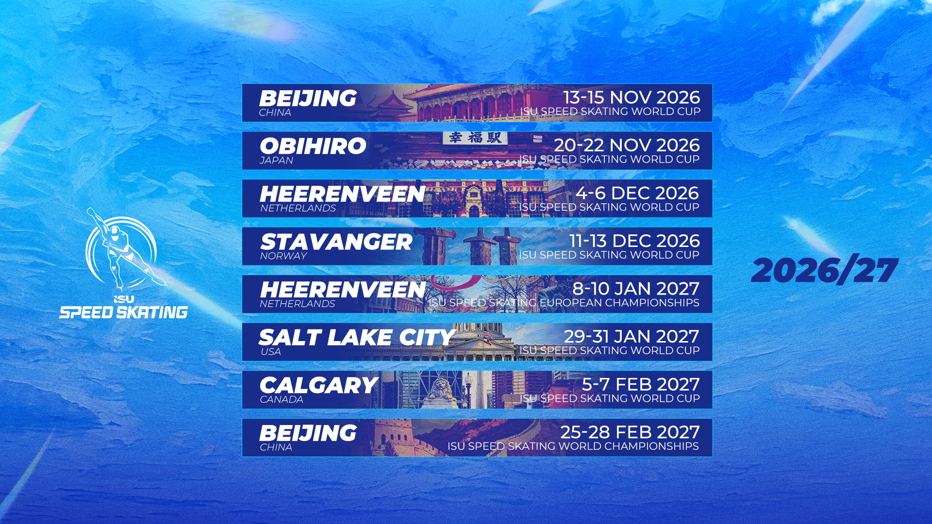 The ISU Speed Skating Event Calendar 2026/27 includes the full competition schedule for the season, featuring ISU Speed Skating World Cup events and major Speed Skating championships.