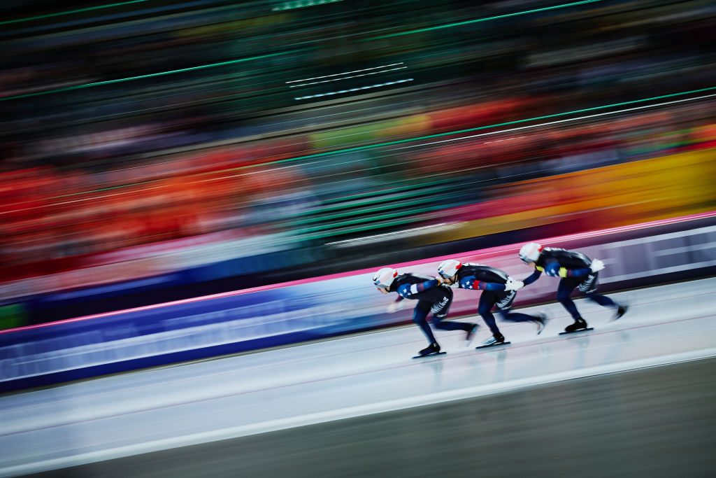 World champions: Team USA on their way to Team Pursuit gold at the 2025 ISU World Speed Skating Single Distances Championships in Hamar, Norway © ISU