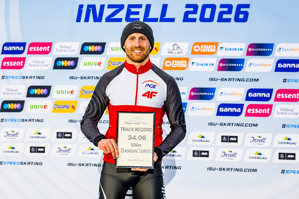 In the second 500m of the weekend in Inzell, Damian Zurek (POL) broke his own track record once more. After skating 34.09s on Friday, he clocked 34.06s on Sunday.