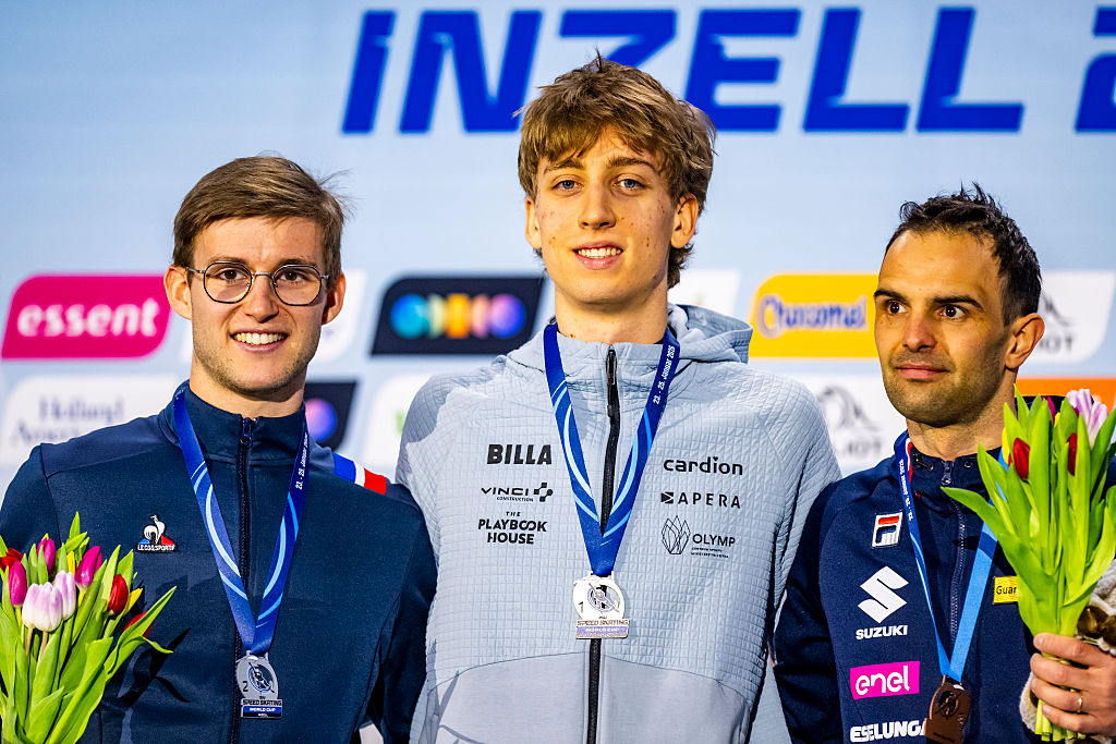 Mathieu Belloir (FRA, left) came closest to catching Jílek (center) and took silver. Andrea Giovannini (ITA, right) took bronze but couldn't retain the overall Trophy © ISU
