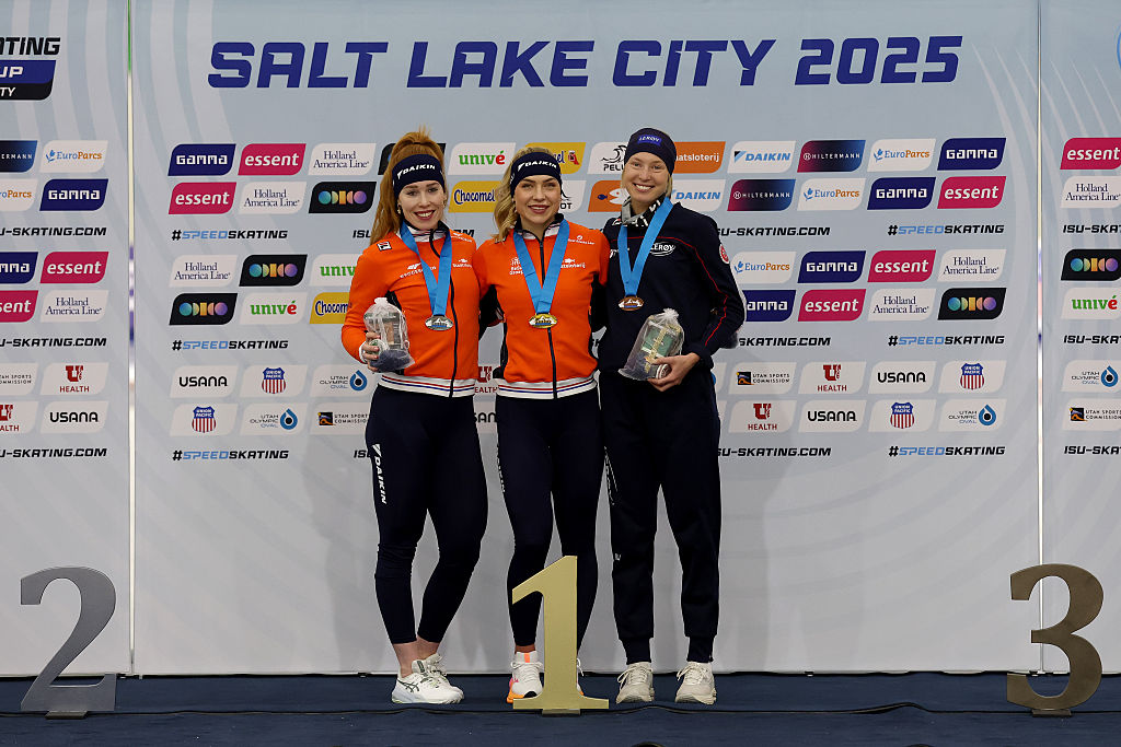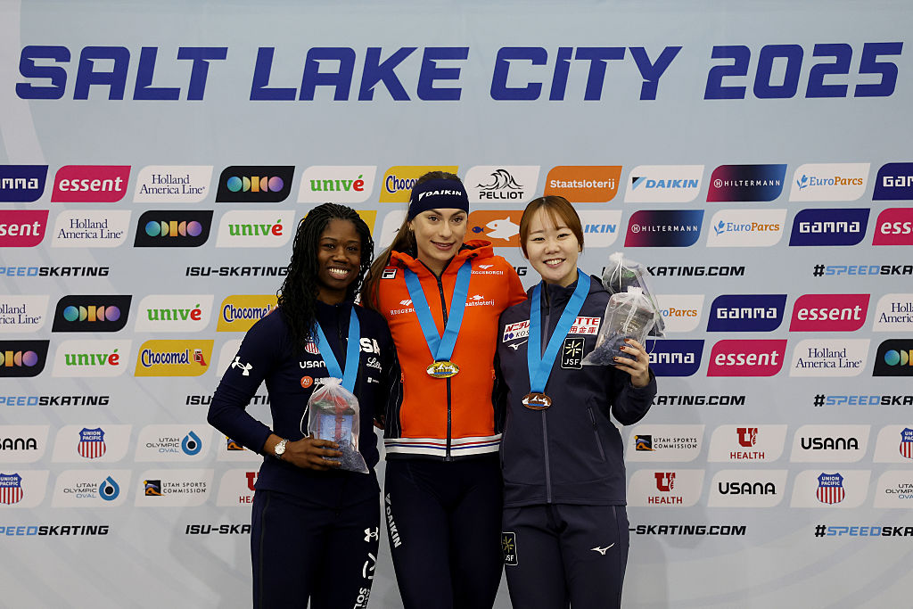 Medalists Erin Jackson (USA, left), Kok (center) and Yukino Yoshida (JPN, right) were the only skaters to break the 37-second mark in Saturday's 500m. © ISU