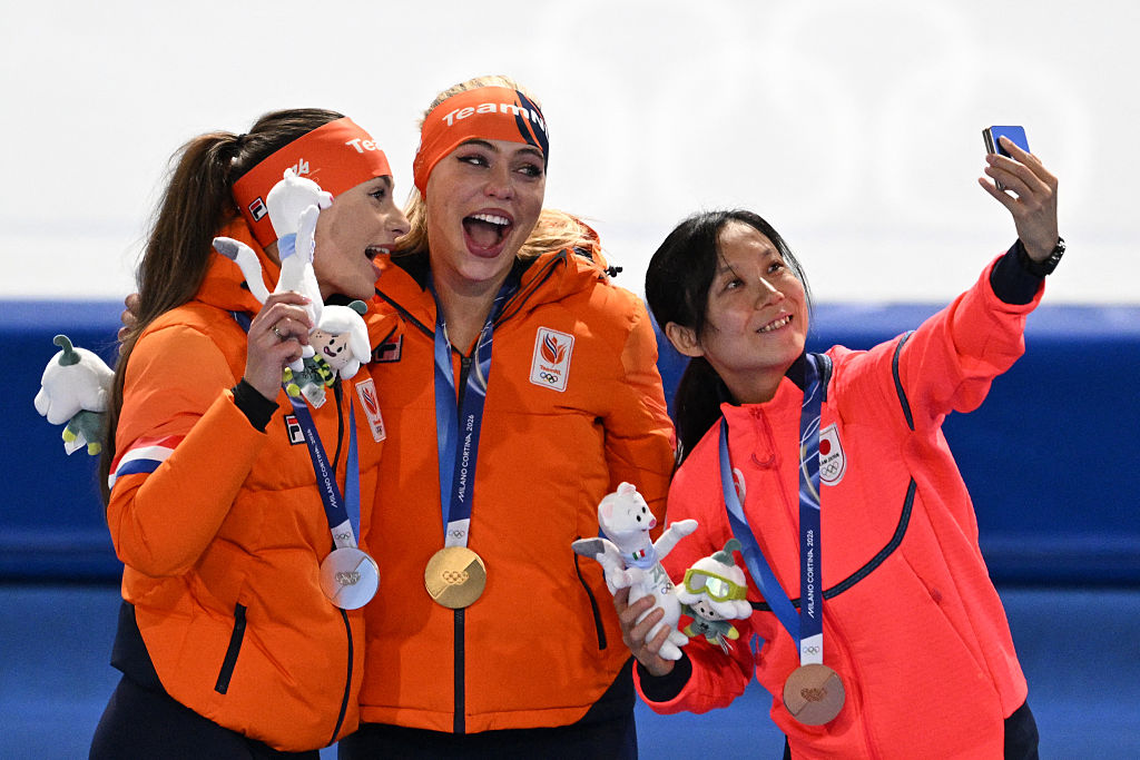 Kok, Leerdam and Takagi celebrate their medals with a podium selfie © Getty Images