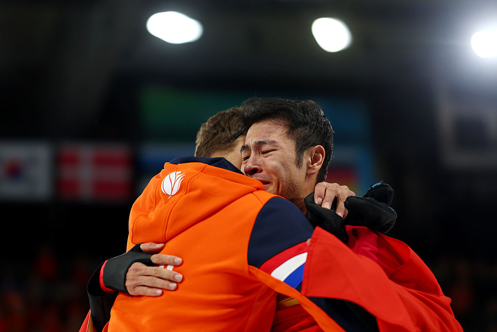 Mutual appreciation: Nuis and Ning embraced on their lap of honor © Getty Images