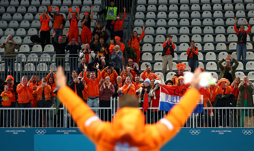 Nuis, now the Olympics' most successful 1500m skater, salutes the Dutch support in Milan © Getty Images