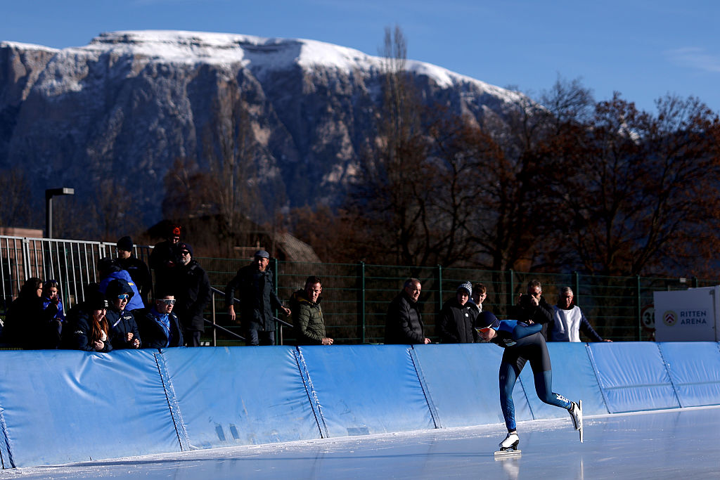 Kristina Shumekova (KAZ) swapped the Milan arena for the open-air ice of Collalbo but won the same trio of gold medals in the 1000m, 1500m and 3000m, pictured. © ISU