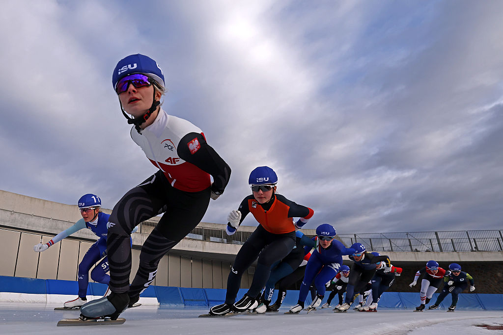 Hanna Mazur (POL) leads the Mass Start field on her way to adding another gold to her 500m win and 1000m bronze. © ISU