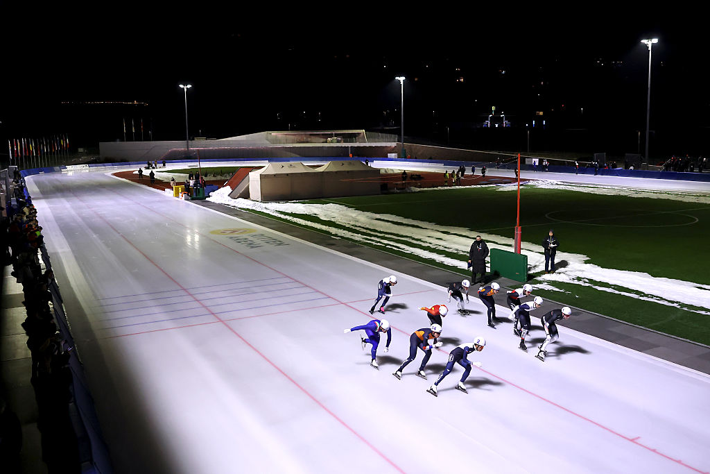 The Junior Men's Mass Start field speeds around Collalbo's picturesque Ritten Arena. Whang Seojoon (KOR) emerged victorious. © ISU