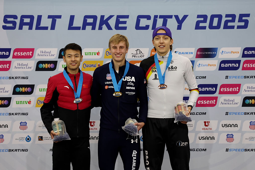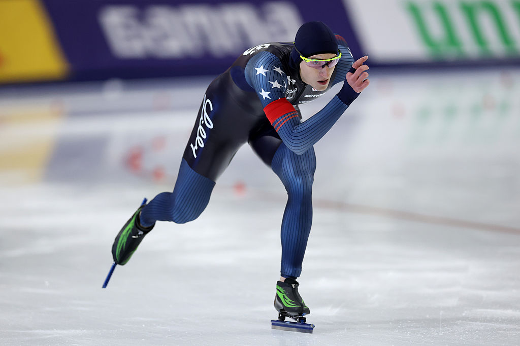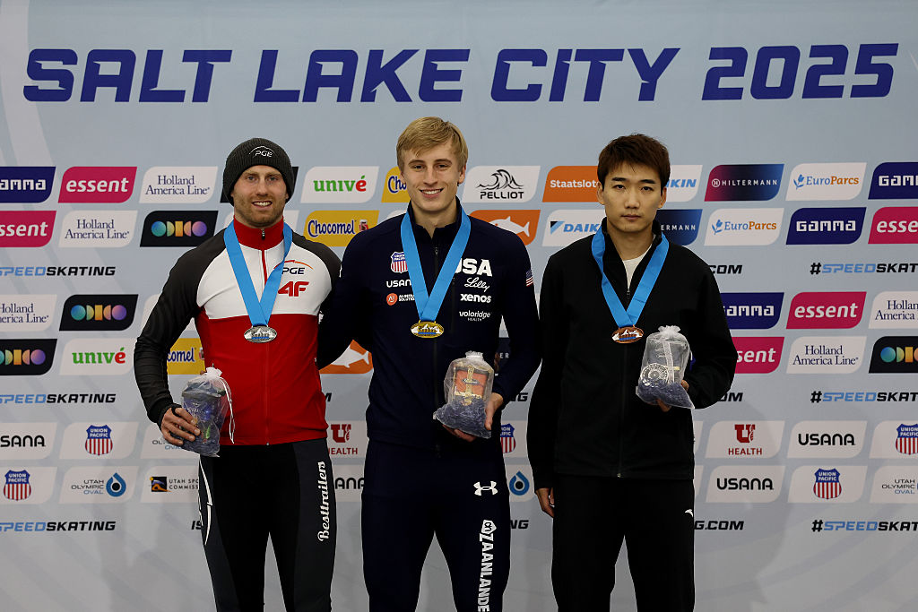 Jordan Stolz (USA) added 500m and 1500m gold to Friday's 1000m victory at the ISU World Cup in Salt Lake City (USA). © ISU