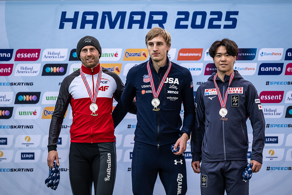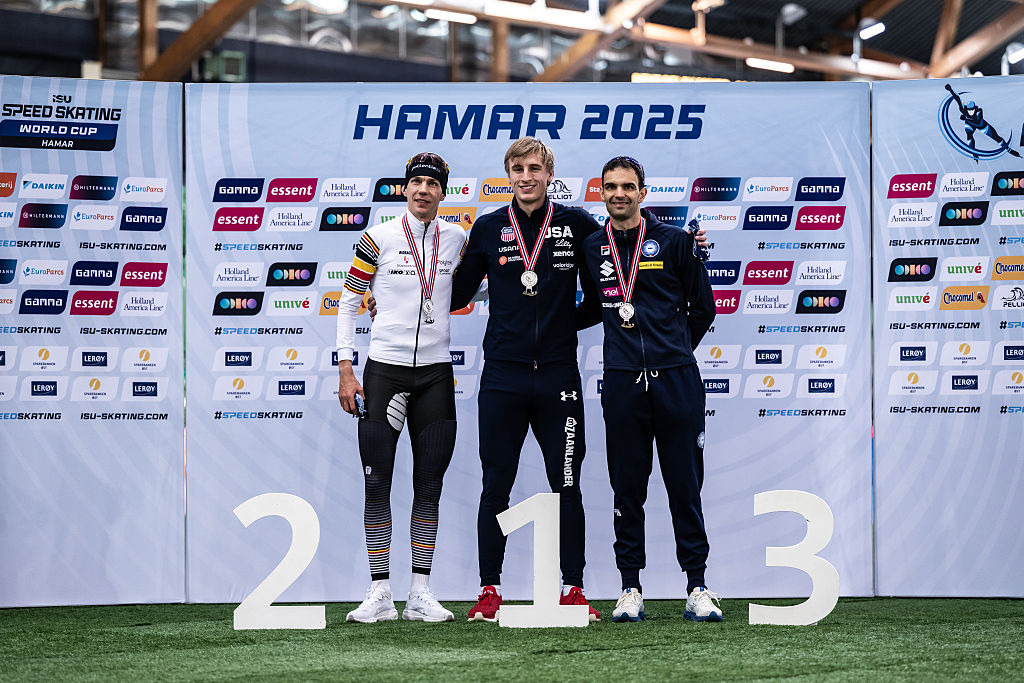 Stolz, center, was concerned with the speed of Zurek's finish as he held on to win his fourth gold of the Hamar World Cup. Rookie Yuta Hirose (JPN, right) took bronze. © ISU