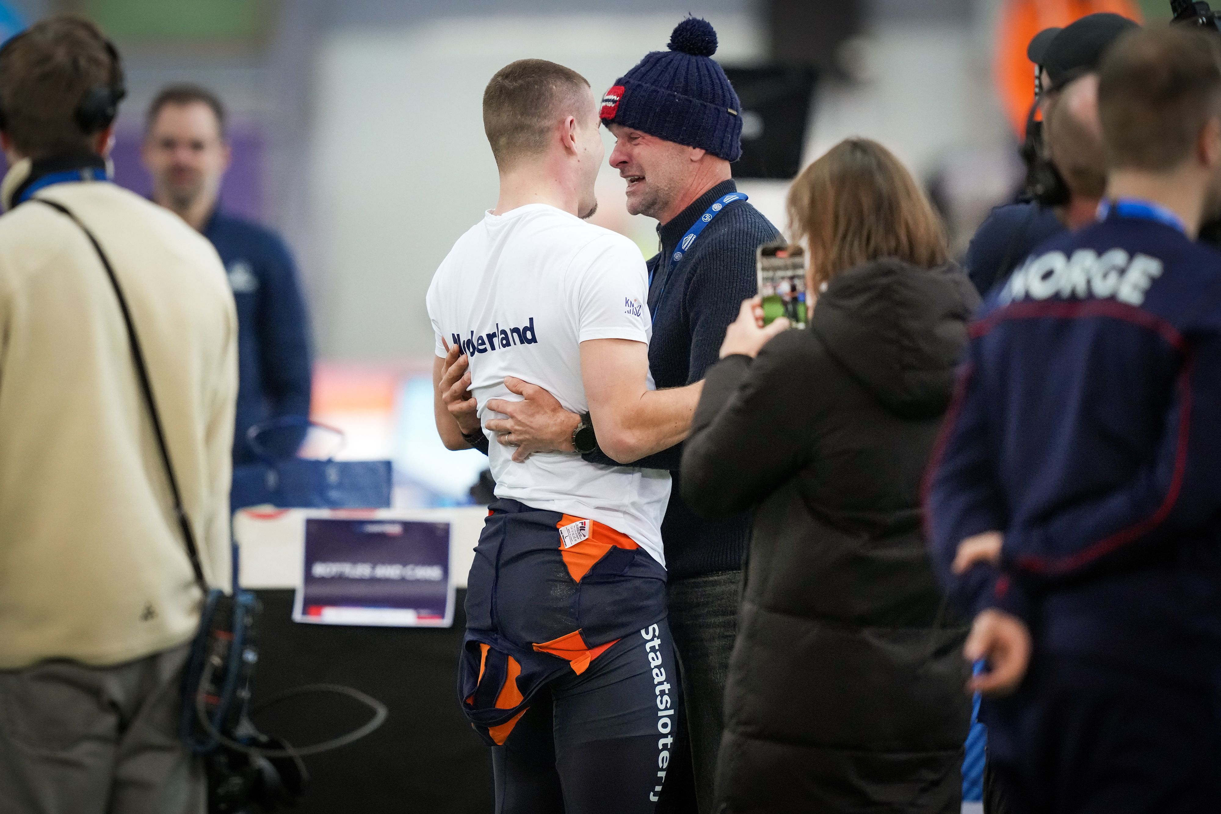 Joep Wennemars with his dad Erben Wennemwars during the ISU World Speed Skating Single Distances and Team Competitions Championships 2025 in Hamar, Norway © Getty Images