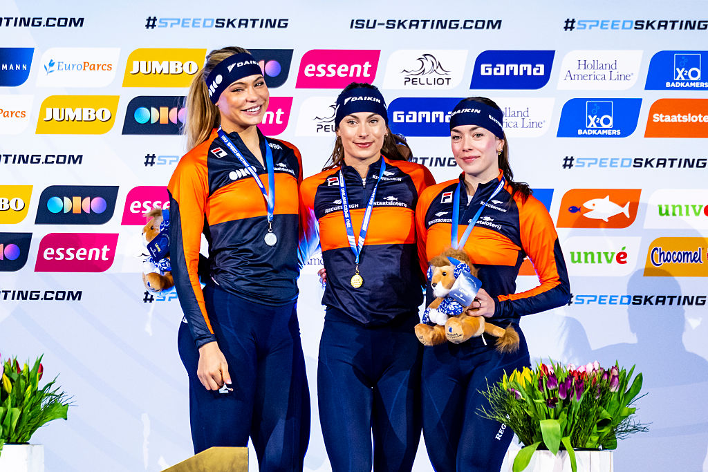 Kok (center) faces the challenge of Dutch teammates Jutta Leerdam (left) and Marrit Fledderus (right), as well as Brittany Bowe (USA) in the 1000m © ISU