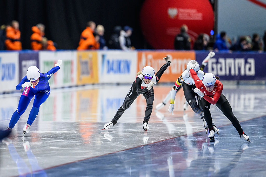 Fran Vanhoutte (BEL, right) hung in after an early attack to take bronze behind Thorup and Lollobrigida © ISU