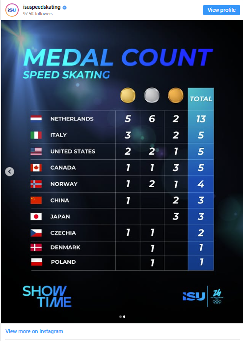 - Stolz also topped the individual Long Track Speed Skating medal table with 2 gold medals and a silver. Francesca Lollobrigida (2G, 0S, 0B) came second, while Valérie Maltais (CAN) and Ning Zhongyan (CHN) shared third place with 1 gold and 2 bronzes