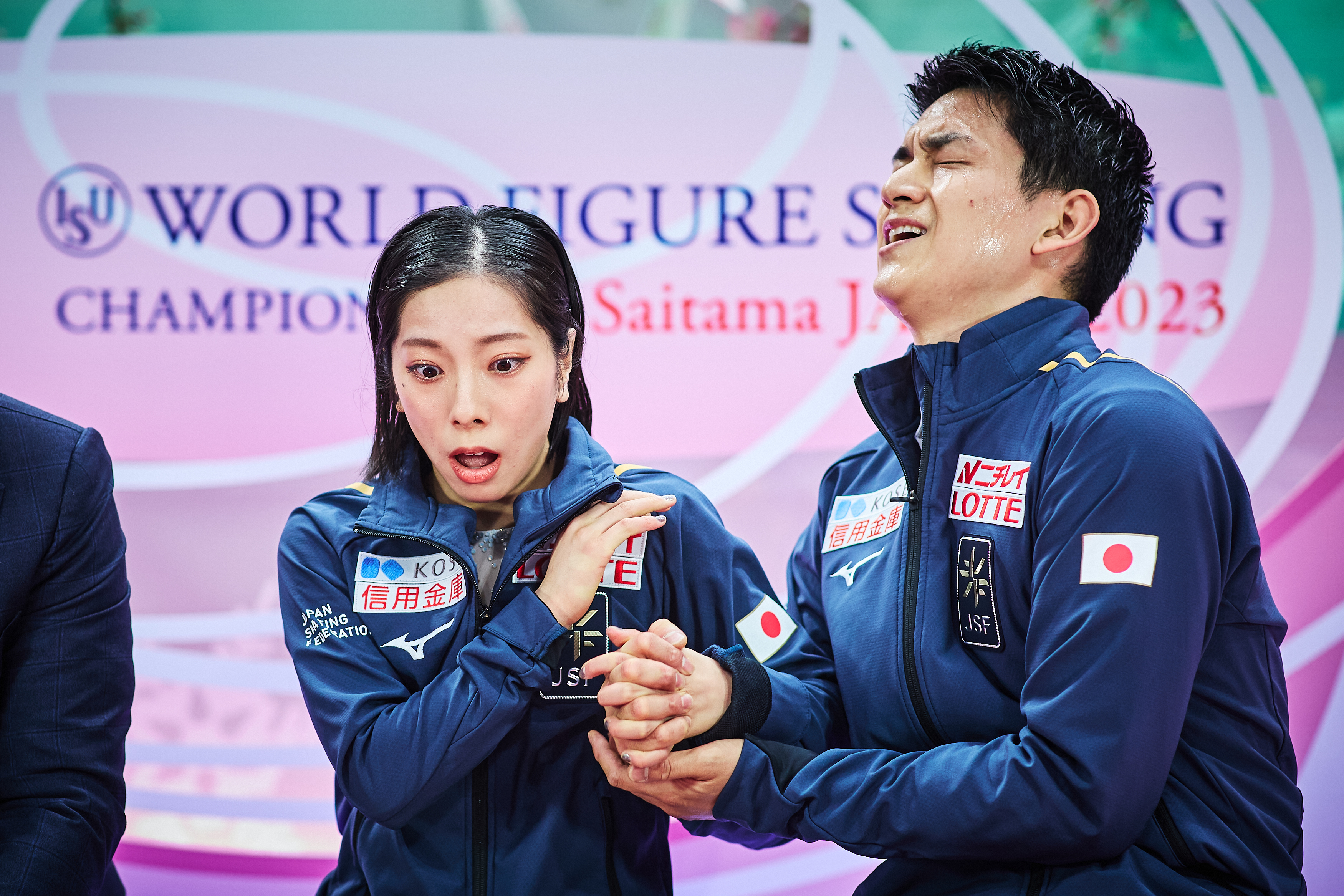 Riku Miura and Ryuichi Kihara react at the kiss and cry in the Pairs Free Skating during the ISU World Figure Skating Championships in Saitama, Japan, 2023 © ISU