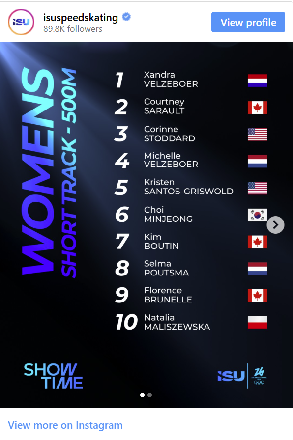 Women's 500m Quarterfinals are done. Crystal Globe Winners Courtney Sarault, Kristen Santos-Griswald and defending champion Arianna Fontana are through to the next round.