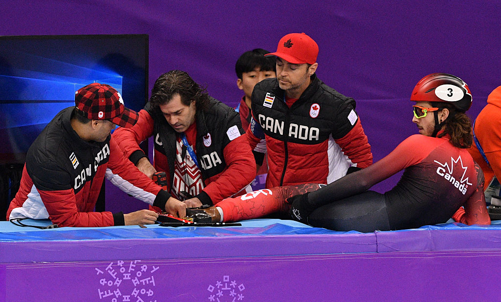 Samuel Girard's blades receive running repairs from Team Canada's technicians at the 2018 Olympic Winter Games © Getty Images