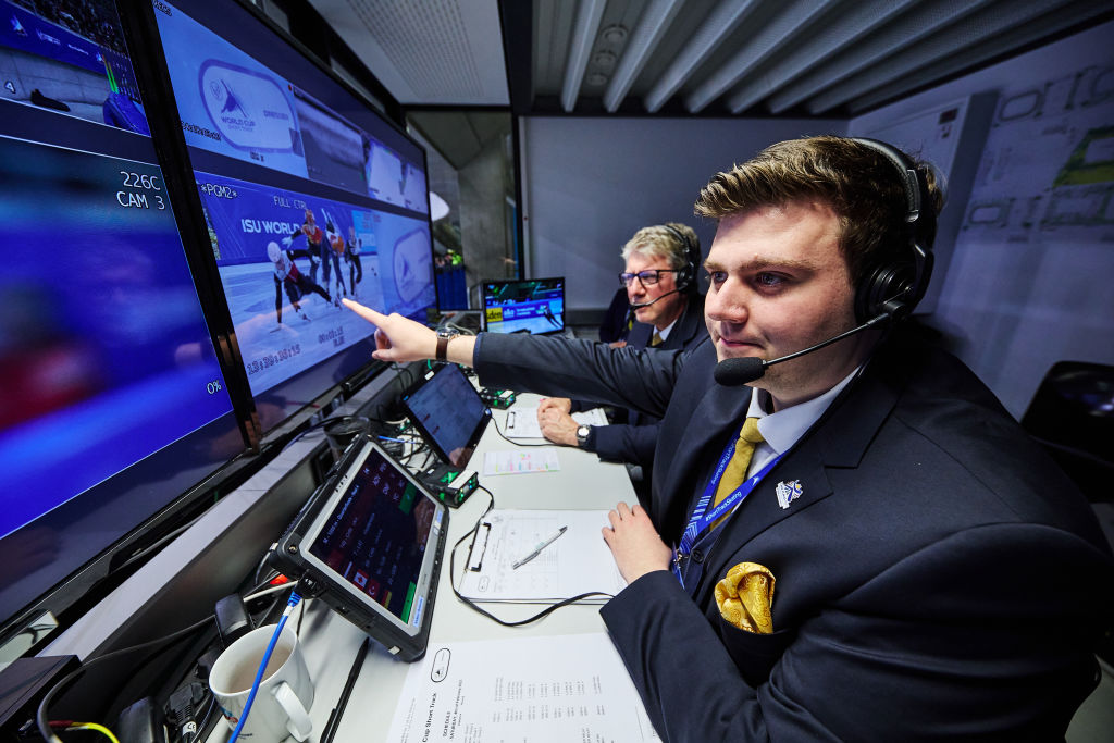 Referees have access to video replays to determine which skaters are at fault for a fall © ISU