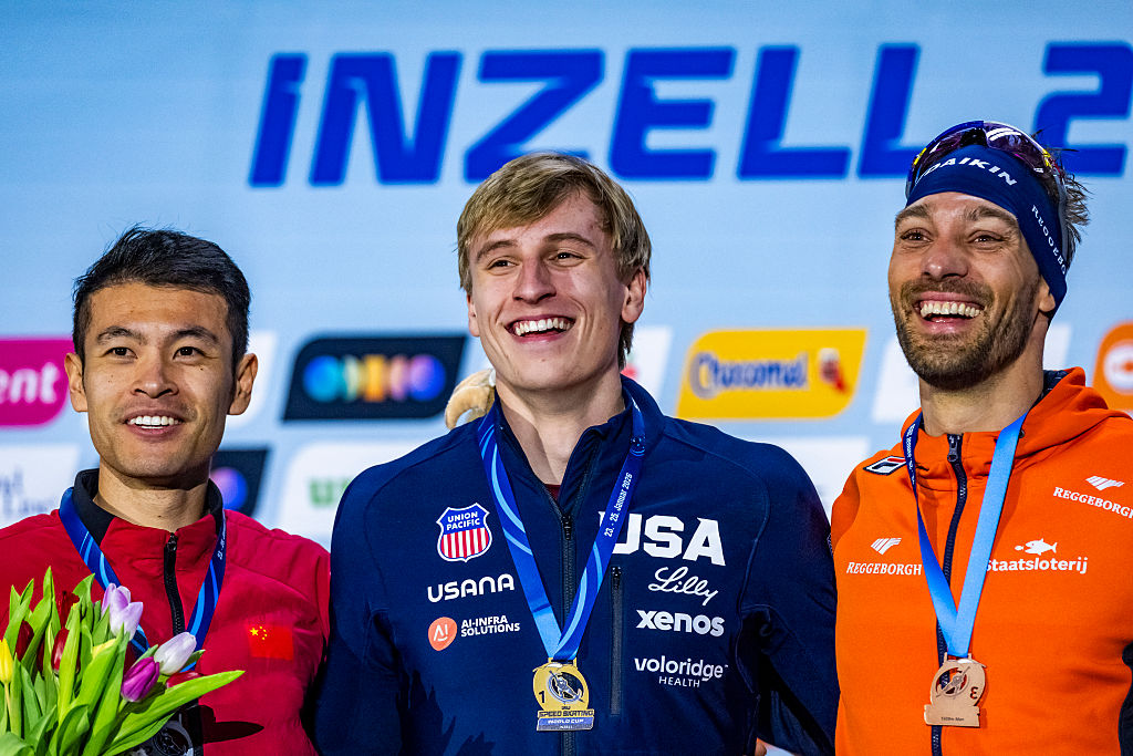 Jordan Stolz (USA, left) secured the 500m World Cup Trophy with second place, Marten Liiv (EST) winning his first World Cup medal of the season with bronze © ISU